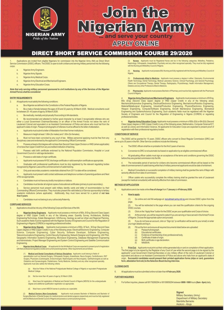 The Nigerian Army has announced the commencement of applications for the Direct Short Service Commission (DSSC) Course 29/2026. This recruitment exercise provides qualified Nigerians an opportunity to be commissioned as officers in specialist corps and services of the Nigerian Army.