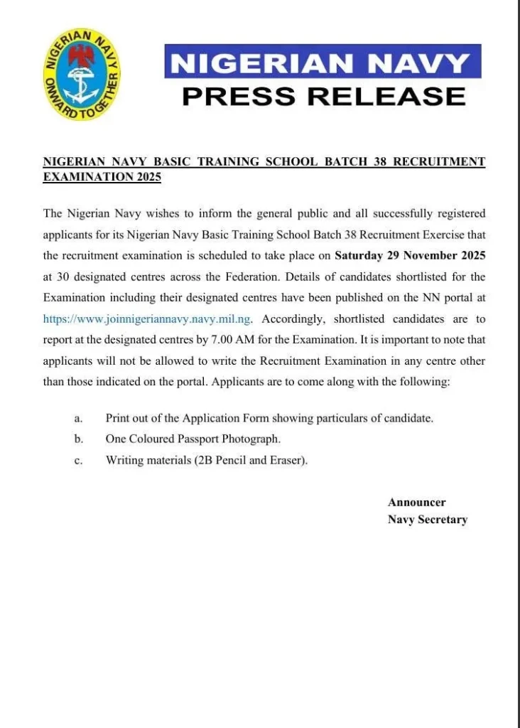 The Nigerian Navy has officially announced the examination date for the Basic Training School Batch 38 Recruitment Exercise. All successfully registered applicants for the Nigerian Navy Batch 38 recruitment are hereby informed that the recruitment examination has been scheduled and examination centres have been published on the official portal.